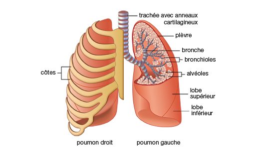 - Ils occupent la majeure partie de la cage thoracique. Le poumon droit se divise en 3 lobes (supérieur, moyen et inférieur) et le poumon gauche en 2 lobes (supérieur et moyen). Le poumon gauche est plus petit que le poumon droit pour laisser la place au cœur.